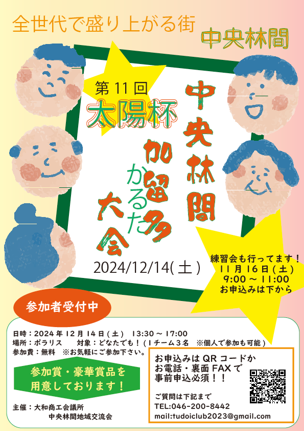 中央林間加留多大会 「中央林間加留多」は、中央林間地域の歴史を楽しく学んでもらうことを目的に作られたご当地カルタで、大人から子どもまで楽しく遊ぶことができます。『中央林間加留多大会』は、その中央林間加留多を使用して幅広い年齢層で地域交流を行おうというイベントです。今年の開催は、コロナ禍での中断を経て第11回の開催となります。再会の成功を記念して「太陽杯」と命名しました。 開催は12月14日土曜日場所はポラリスを予定しています。